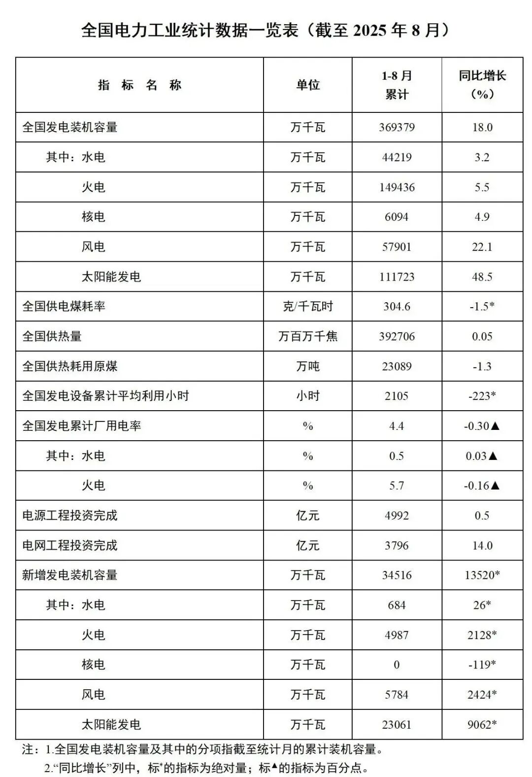 9月26日,国家能源局发布1-8月份全国电力工业统计数据。截至8月底,全国累计发电装机容量36.9亿千瓦,同比增长18.0%。其中,太阳能发电装机容量11.2亿千瓦,同比增长48.5%;风电装机容量5.8亿千瓦,同比增长22.1%。1-8月份,全国发电设备累计平均利用2105小时,比上年同期降低223小时。
